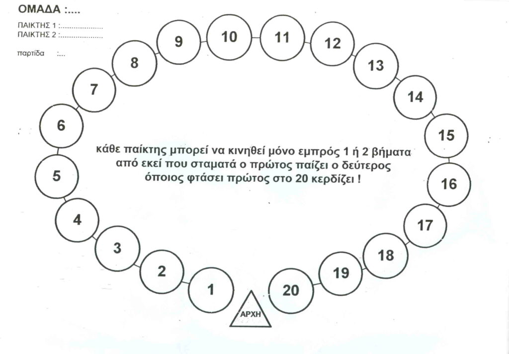 Το παιχνίδι θα μπορούσε να γίνει και παιχνίδι σε υπολογιστή. Ξεκινάω πρώτος και βάζω το σήμα μου στο 2. Στη συνέχεια, όταν ο αντίπαλος κάνει μια κίνηση, εγώ κάνω δύο ή κάνω μια κίνηση, αν ο αντίπαλός μου κάνει δύο. Αν δεν παίξω πρώτος, έχω στο νου μου τους «καλούς» αριθμούς και προσπαθώ να τους πιάσω.